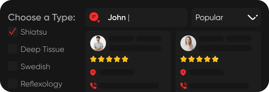 We bring together top-rated specialists and give you full freedom of choice — by gender, massage type, work style, and location. Set up your profile and grow your client base with a subscription that fits your goals — or find your perfect massage therapist today.